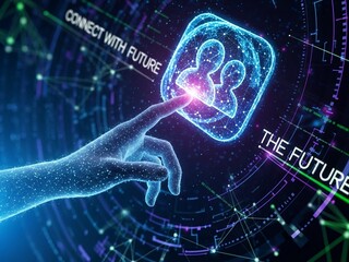 A hand touching a blue glowing digital circular interface representing futuristic technology innovation and secure biometric access for modern business connectivity in the virtual world