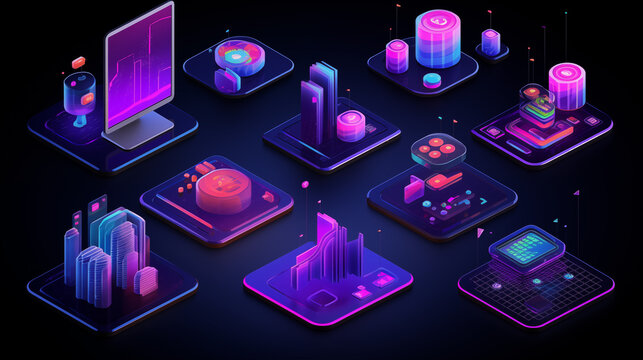 Futuristic isometric technology blocks with glowing digital elements