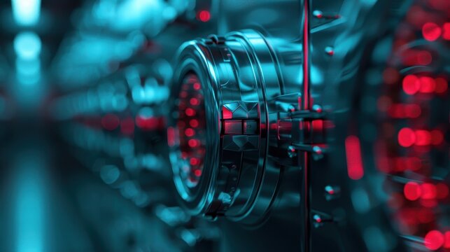 A striking image of a futuristic server room bathed in blue and red neon lights, highlighting advanced computing hardware and the high-tech ambiance of the environment.