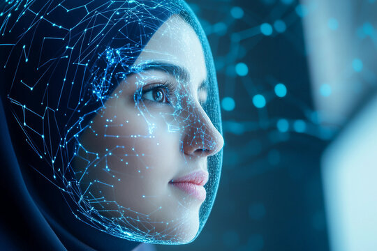 A futuristic concept of artificial intelligence and facial recognition featuring a young woman with glowing augmented reality holographic interface technology scanning her face in a cyber environment
