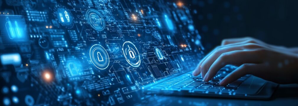 Human hands typing on laptop with futuristic AI interface and digital icons overlay on blue gradient background representing modern technology concept.