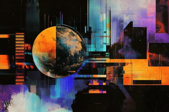 Shapes and globe represent data processing in a vibrant abstract composition, shapes and globe over data processing