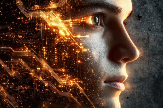 A futuristic portrait of a person's face overlaid with glowing circuit board patterns, symbolizing technological integration with humanity.