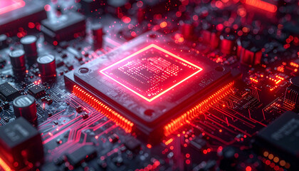 The Essence of Innovation: The core of a digital circuit, a symphony of technology, bathed in fiery red light, signifying the heart of innovation and cutting-edge advancements.