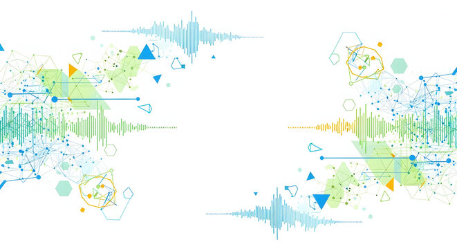 Abstract sound wave and geometric shapes digital art with blue and green elements against a white background
