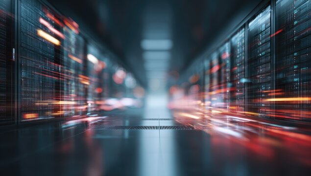 Long hallway view of server racks with blurred streaks of light, focused on data transfer