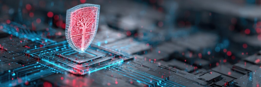 Glowing digital shield over circuit board, red accents, with abstract tree pattern, futuristic