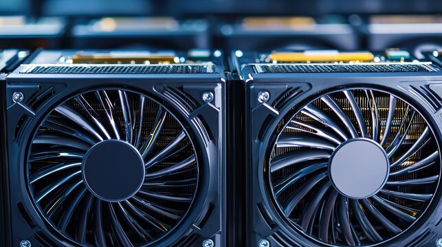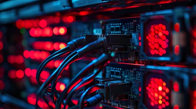 close-up of a cryptocurrency mining rig in a data center. The rig is powerful and efficient, and there are other rigs in the background
