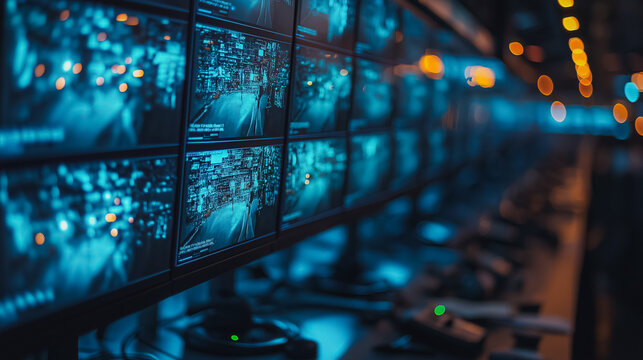 A row of computer monitors with a blue background. The monitors are all turned on and are displaying different images. Scene is one of technology and productivity