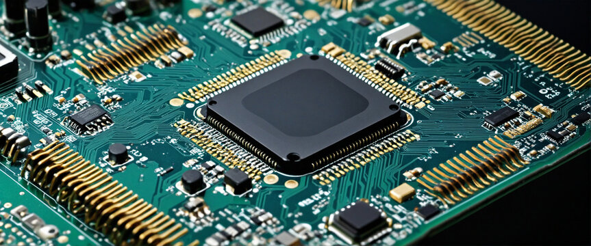 closeup on an advanced microchip or cpu of a powerful computer board with technical details elements as wide banner design with copy space area. Generative AI