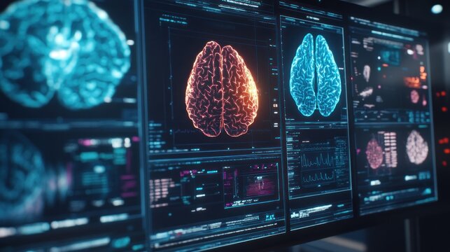 Multiple monitor screens displaying brain scans with complex data visualizations.