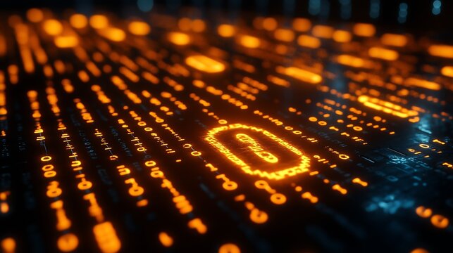 Digital data stream with abstract glowing elements, representing technology, innovation, and information flow in a futuristic background. Cybersecurity and data analysis concept.
