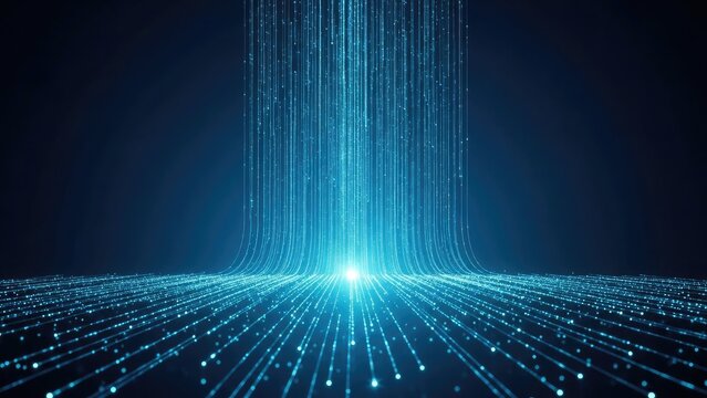 A digital landscape glows with blue light. Flowing lines and particles create a futuristic scene. Data streams upward