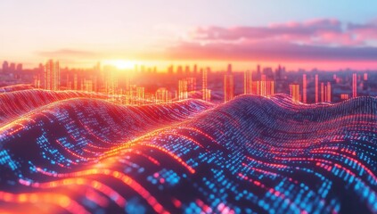 Abstract city landscape at sunset, with wavy data streams, digital waves, and vibrant colors.  Complex patterns of light and color overlay a cityscape, conveying futuristic and dynamic technology