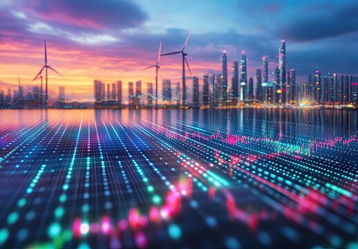 Futuristic cityscape with digital network overlay at sunset.  Wind turbines and modern buildings are reflected on a vibrant digital grid of light, representing energy and technology convergence