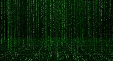 Digital matrix background with glowing green binary code streams in dark abstract tech landscape