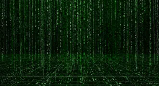 Digital Rain: Green Binary Code Waterfall with Grid Matrix Abstract Background