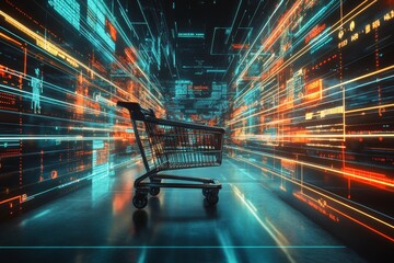 Futuristic smart retail solutions  shopping cart in a data driven environment with glowing lines