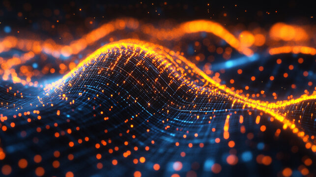 Abstract digital landscape with glowing grid and flowing waves