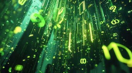 Digital landscape featuring cascading green data streams, resembling futuristic matrix environment, evokes sense of advanced technology