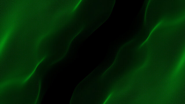 Green color hi-tech particles slowly moving in cyberspace forming loop able wave pattern on black background