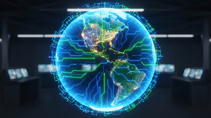 Holographic earth globe with digital circuit overlay in futuristic cyber technology design