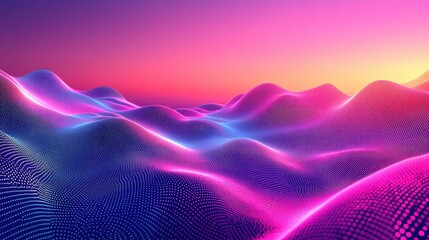 Abstract particle landscape creating a sense of futuristic data visualization and digital connectivity, with vibrant glowing colors highlighting the flowing wave surface