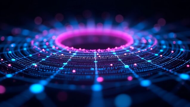 Vibrant digital vortex composed of concentric circles, glowing dots and lines in pink and blue hues creating a futuristic and dynamic visual effect