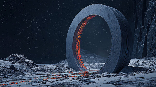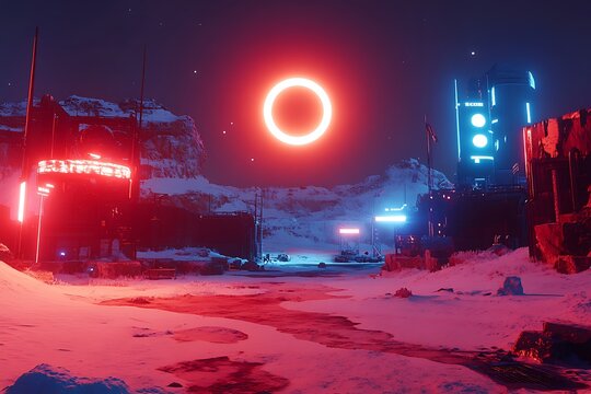 Futuristic winter landscape features neon lights and alien elements