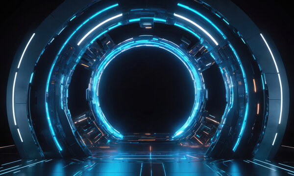 A blue glowing ring encircles a dark, futuristic portal