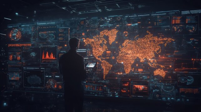 Silhouette of a person analyzing data on a futuristic digital world map display in a dark room with glowing interfaces.