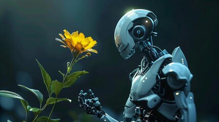 Close up shot of a robot trying to touch a beautiful small yellow flower, standing against dark background