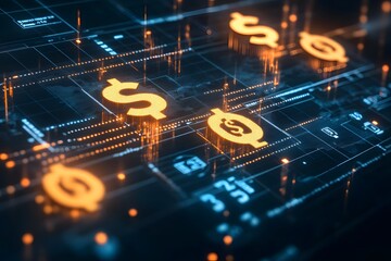 Illuminated dollar symbols on a futuristic digital interface with dark blue and orange glowing design background