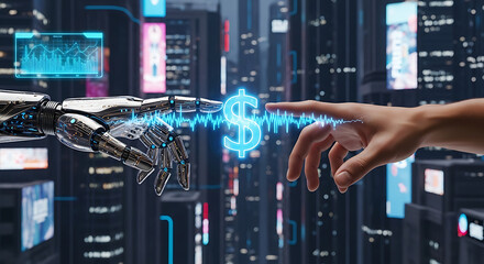 A person's hand touching a glowing dollar symbol on a futuristic holographic financial interface.