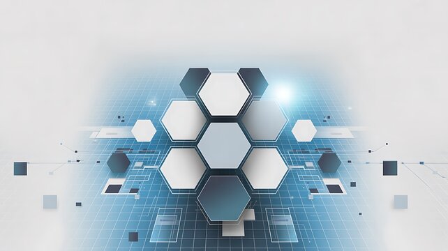 Hexagonal grid structure with glowing light and digital elements on blue background abstract technology