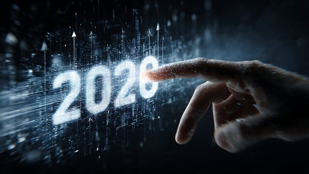 Future forward finger touches glowing 2026 digital interface with rising data charts, symbolizing innovation and growth