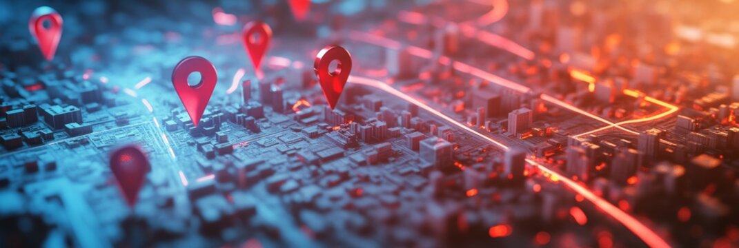 Stunning 3D render of glowing red location markers on a futuristic city map.  Ideal for tech, navigation, or global network concepts. Evokes themes of connectivity, data, and locationbased services.