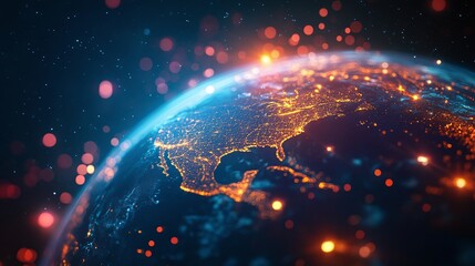 illuminated virtual globe with glowing lights highlighting continents north and south america representing technology data visualization connectivity and futuristic communication