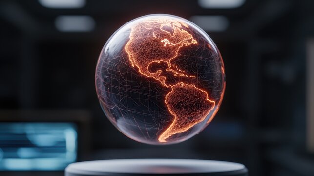 A glowing digital globe of the Americas hovers above a surface, illustrating a futuristic and connected world.
