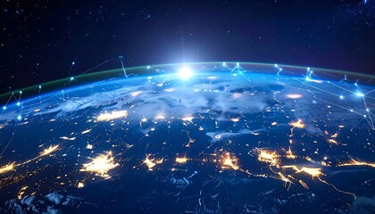Futuristic illuminated digital globe with connected continents displaying network nodes