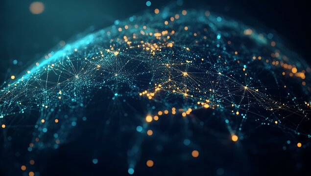 A luminous blue sphere of interconnected lines and points hovers against a