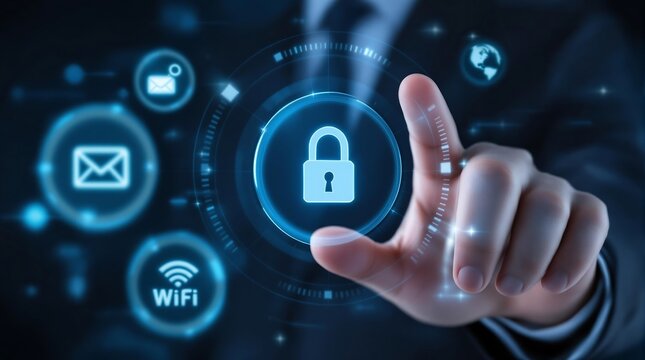 Hand interacting with digital interface displaying security lock wifi and email icons on dark background