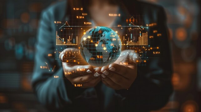 Close-up of a business woman hand holding a glowing globe, symbolizing global business strategies and sustainability, with charts and graphs projected. Generative AI.