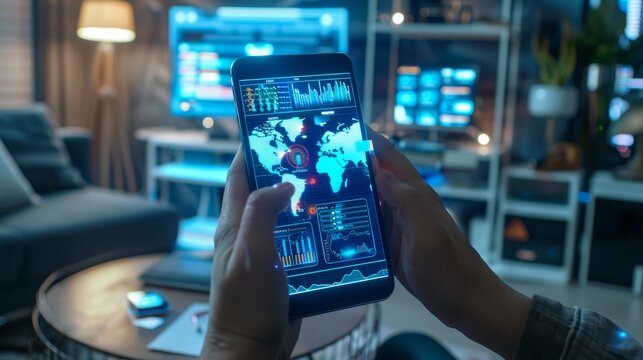 Digital Wealth Visualization Smartphone Hologram Displaying Personal Finances in Home Office Setting