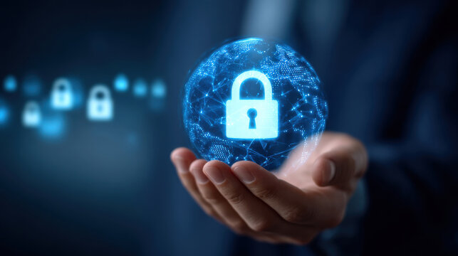 Hand holding glowing digital globe with lock icon signaling cybersecurity protection and data privacy