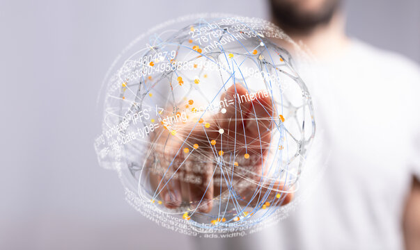 Abstract image of a person interacting with a digital globe filled with data and code.