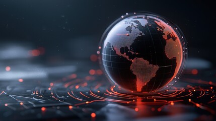 Digital globe with red data lines on a futuristic background, representing global technology and network connection.