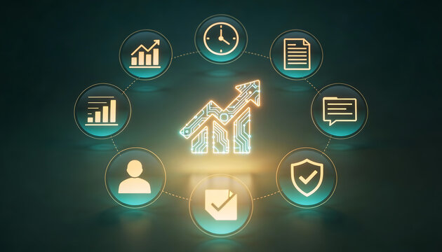 3D digital illustration of sustainable business growth showing a glowing circuit board arrow pointing up surrounded by icons for analytics data security time and document management
