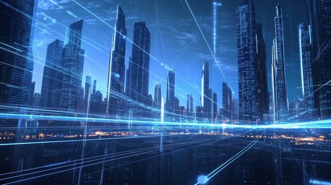 Futuristic cityscape with a glowing blue digital data network overlay.