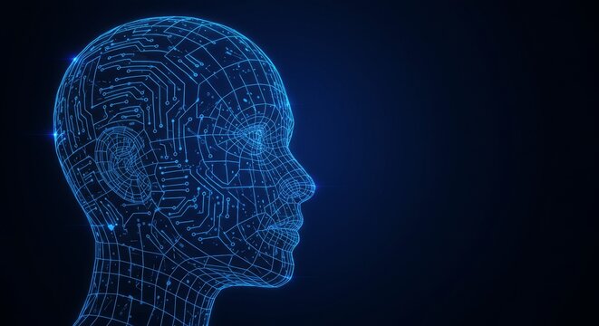 Futuristic AI concept with glowing human head silhouette and digital circuit pattern